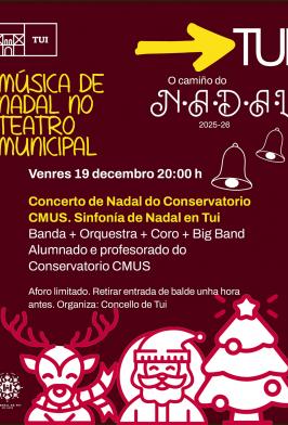 O venres 19 de decembro, ás 20.30 h no Teatro Municipal, terá lugar o concerto Sinfonía de Nadal en Tui a cargo de alumnado e profesorado do Conservatorio Profesional e...