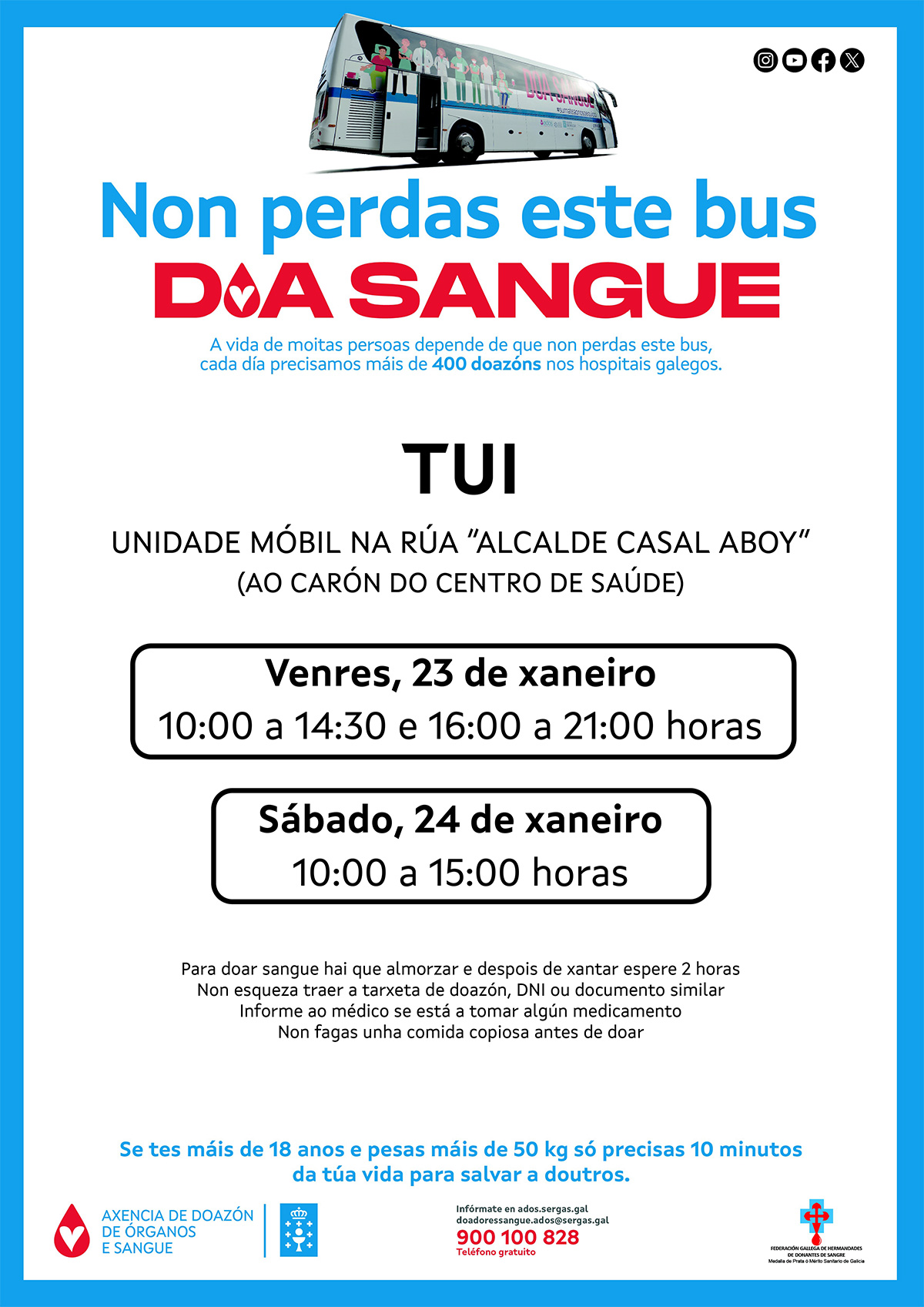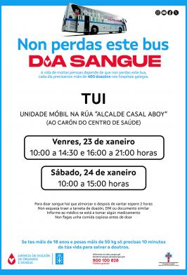A Unidade Mobil de Doazón de Sangue estará en Tui o venres 23 e o sábado 24 de xaneiro na rúa Casal Aboy, a carón do centro de saúde. Poderase doar sangue o venres...