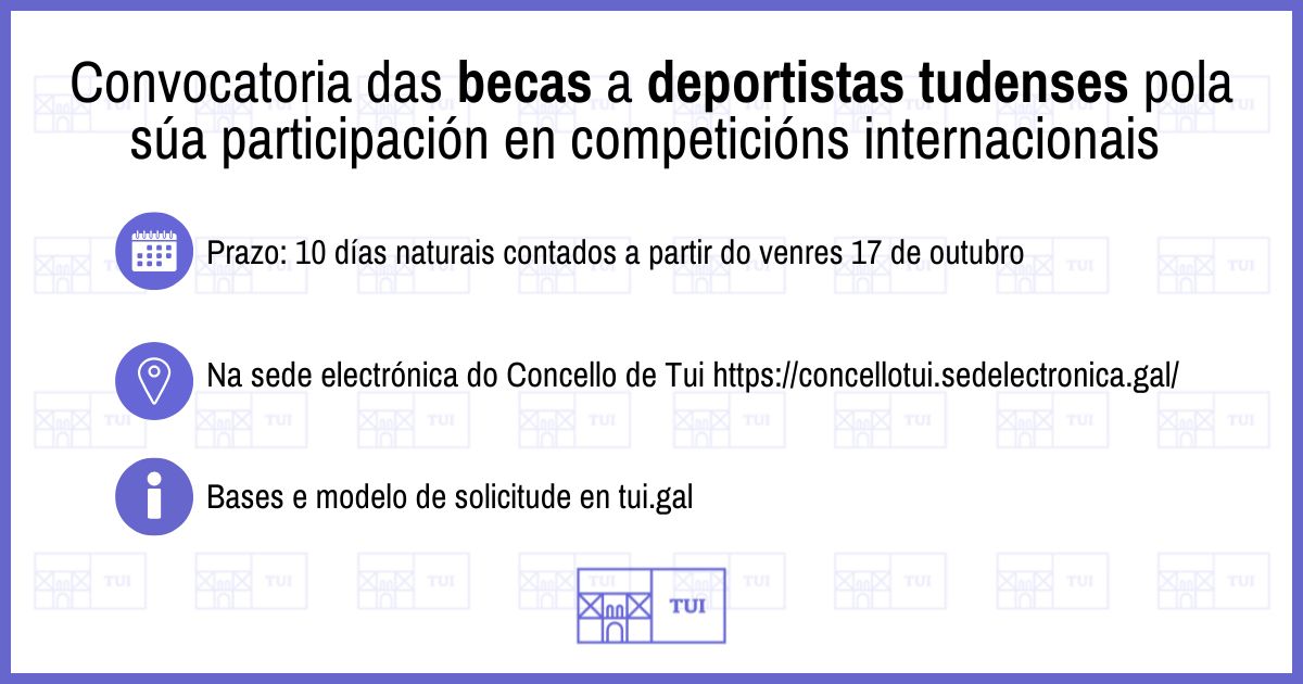 O prazo de presentación comeza mañá venres, 17 de outubro, logo de que hoxe xoves, se publicara no Boletín Oficial da Provincia de Pontevedra o extracto das bases reguladoras para a concesión destas becas. Os e as deportistas tudenses terán de prazo 10 días naturais para presentar na sede electrónica do Concello de Tui o impreso de solicitude e a documentación requirida.