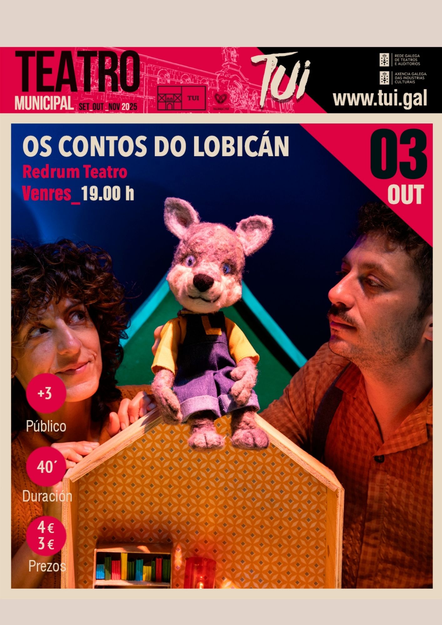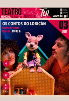 O venres, 3 de outubro, ás 19 h Redrum Teatro presentará no Teatro Municipal de Tui “Os Contos do Lobicán”. É un espectáculo de monicreques musical destinado a nenos e nenas...