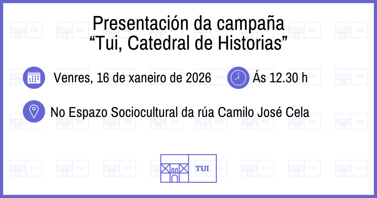 Mañá venres, 16 de xaneiro, ás 12.30 h no Espazo Sociocultural da r/Camilo José Cela terá lugar a presentación da campaña “Tui, Catedral de Historias” conmemorativa do 800 aniversario da Consagración da Catedral de Tui. O Concello de Tui levará a próxima semana esta campaña a FITUR, a Feira Internacional de Turismo de Madrid, referente mundial no sector turístico.