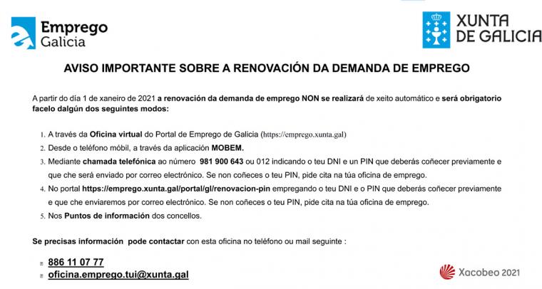 Dende a Oficina do Servizo Público de Emprego de Tui informan que a partir do 1 de xaneiro de 2021 a renovación da demanda de emprego NON se realizará de xeito automático e será...