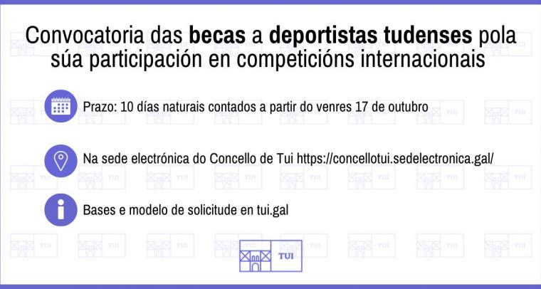 O Concello de Tui, na súa aposta polo deporte, incrementou até os 15 mil euros a partida destinada á concesión de becas a deportistas tudense que teñan participado en competicións...