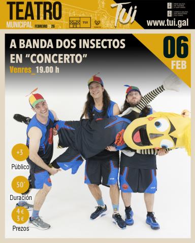 A Banda dos Insectos estará en concerto no Teatro Municipal de Tui o venres, 6 de febreiro, ás 19 h. Esta agrupación formada por Adri Salgado, batería e voz; Eduardo Cadenas, baixo e coros; Juan Pérez, guitarra e coros, e Manuel Fernández, animador, presenta un novo proxecto de música rock en galego que busca familiarizar á rapazada cos valores cooperativos e do deporte.