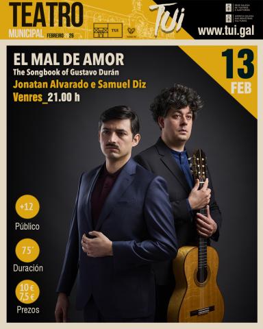Interpretarán tres cancioneiros que Gustavo Durán, pianista, compositor e pioneiro da etnomusicoloxía nado en Barcelona en 1906, recompilou entre 1944 e 1963. Trátase dun repertorio moi descoñecido e en gran parte inédito formado dende  melodías cortesás españolas do século XVI até yaravíes peruanos modernos.  Jonatan Alvarado e Samuel Diz presentarán en Tui estas composicións que configuran o disco “El mal de l’amor” gravado en abril de 2025 en Dartington Hall, Inglaterra, baixo a produción de Lucy Durán.