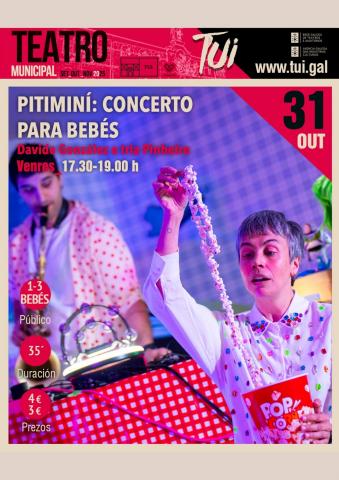 O venres 31 de outubro Davide González e Iria Pinheiro interpretarán no Teatro Municipal de Tui “Pitiminí: Concerto para bebés”. Trátase dun espectáculo sensorial deseñado especialmente para os máis pequenos e para as súas familias. É unha viaxe musical con melodias e sons que estimulan a curiosidade dos bebés nun ambiente seguro e acolledor.