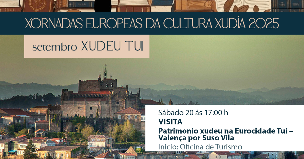 Esta fin de semana continúan as actividades programadas polo Concello de Tui para a celebración das Xornadas Europeas da Cultura Xudía dentro do programa do Setembro Xudeu. Este sábado, 20 de setembro, ás 17 h sairá dende a Oficina Municipal de Turismo, no Paseo da Corredoira, unha visita guiada polo patrimonio xudeu de Tui e de Valença.
