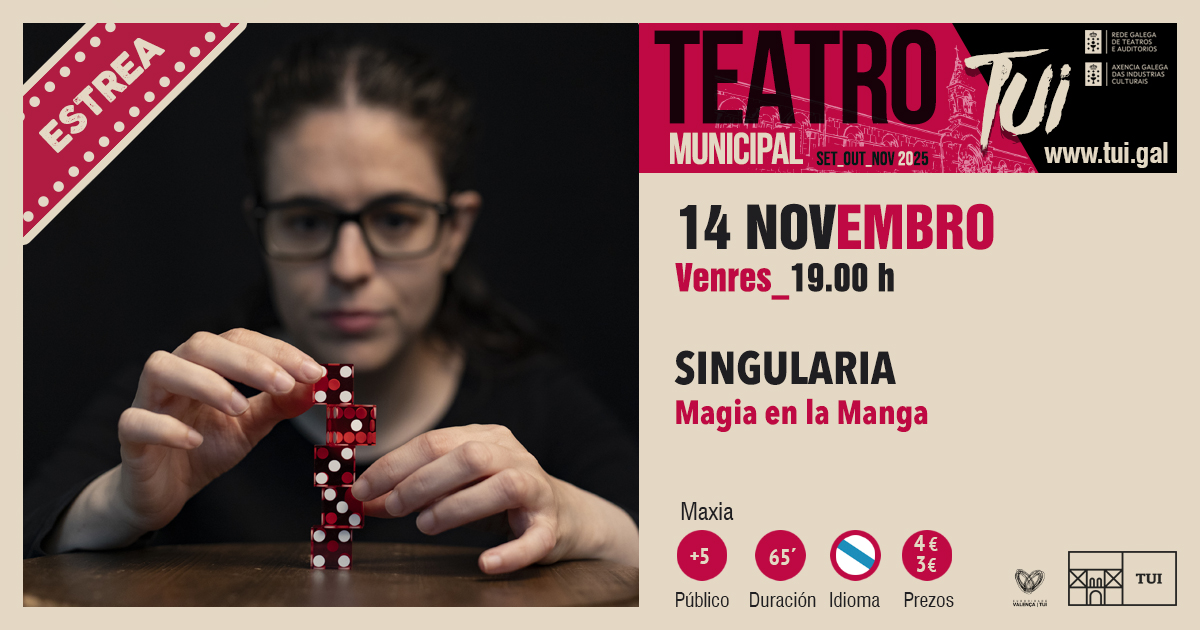 Mañá xoves, 13 de novembro, ás 11 h, no Teatro Municipal de Tui terá lugar a presentación do espectáculo “Singularia” de Magia en la Manga que este venres se estreará en Tui dentro da programación de Outono.