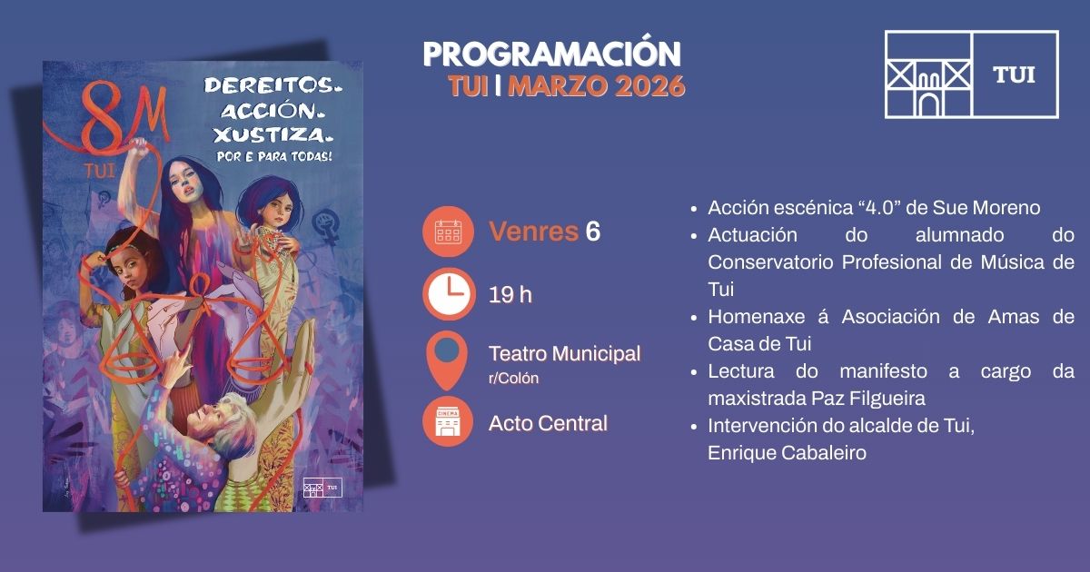 Este acto central da programación do 8M co lema “Dereitos. Acción. Xustiza. Por e para todas1” comezará ás 19 h no Teatro Municipal, con entrada libre até completar o aforo