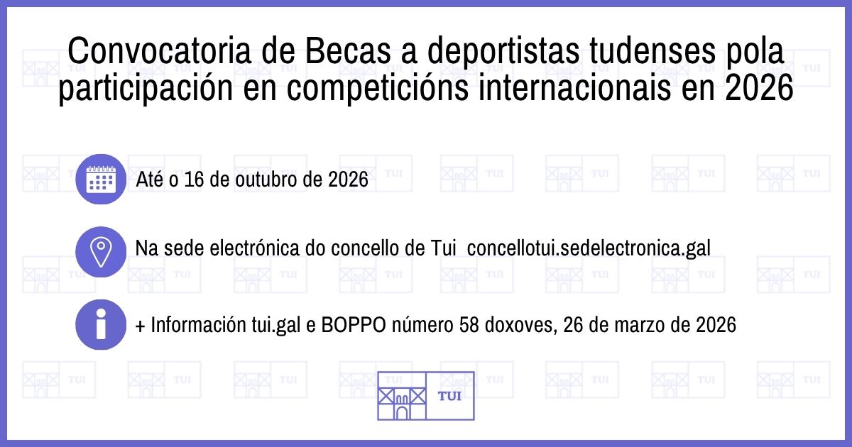 O Concello de Tui apoiará un ano máis ás e aos deportistas que neste ano 2026 participen en competicións federadas de ámbito internacional. O pasado xoves publicouse no Boletín Oficial da Provincia de Pontevedra o extracto das bases reguladoras para a concesión destas becas.