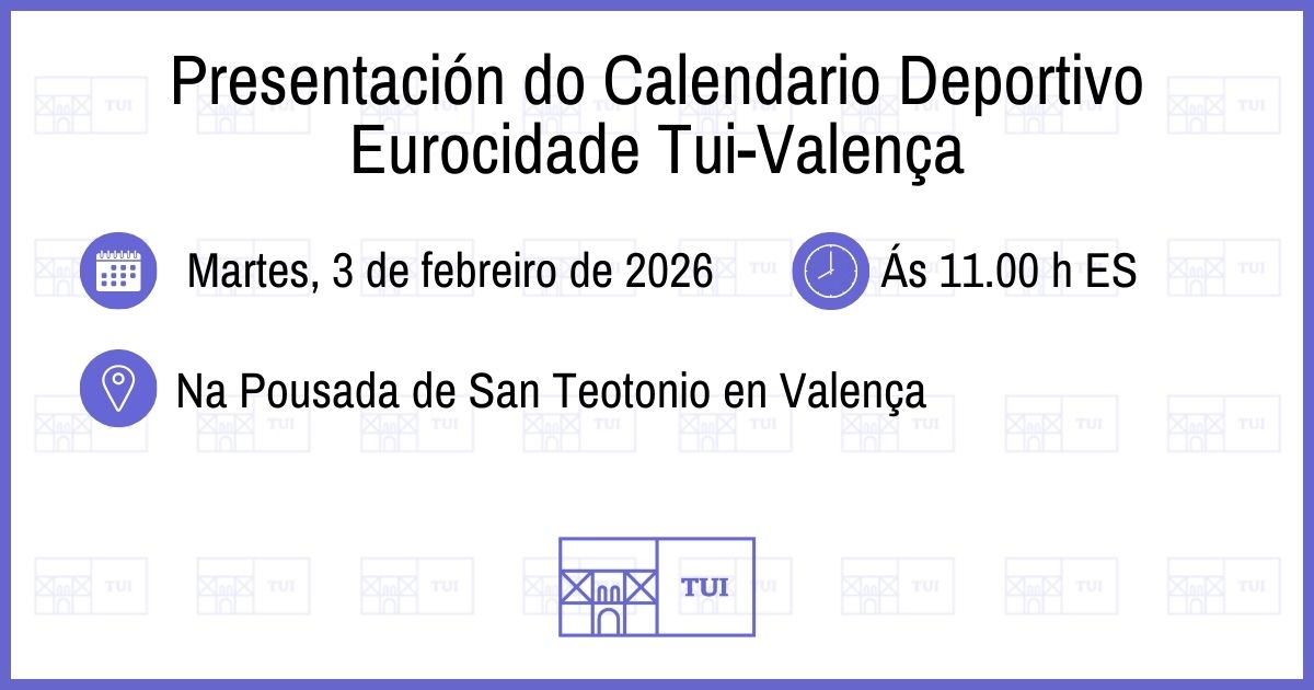 Mañá martes, 3 de febreiro, ás 11.00 horas españolas, na Pousada de San Teotonio de Valença, terá lugar a presentación do Calendario Deportivo Eurocidade Tui-Valença 2026. Nesta nova edición contará con 14 eventos deportivos de 11 modalidades deportivas, que se desenvolverán entre os meses de febreiro e decembro.