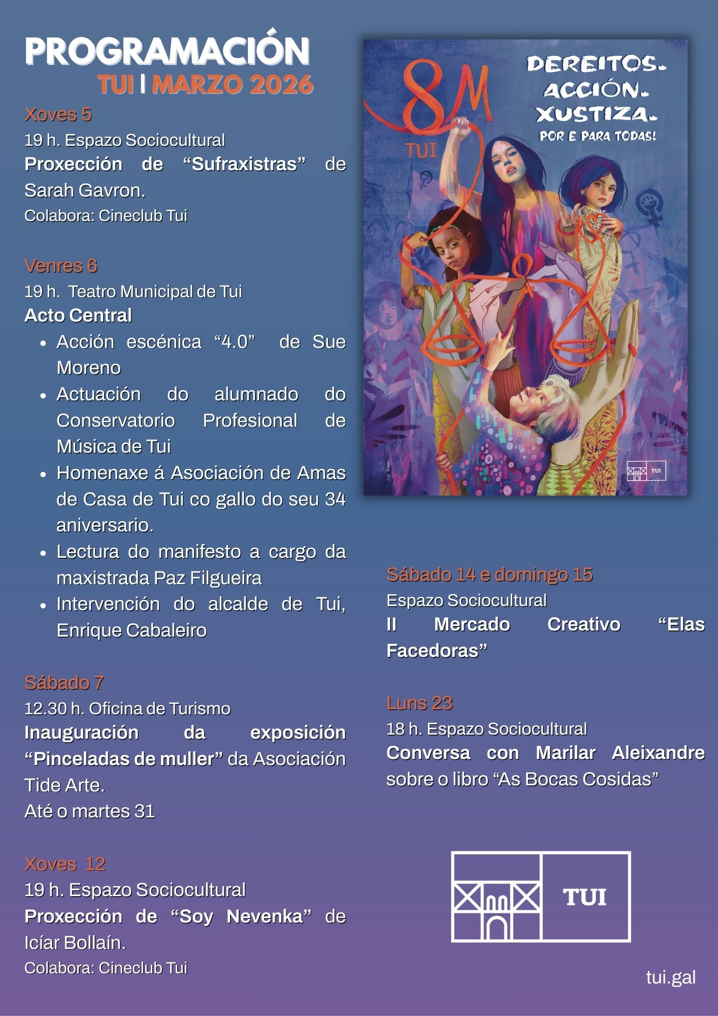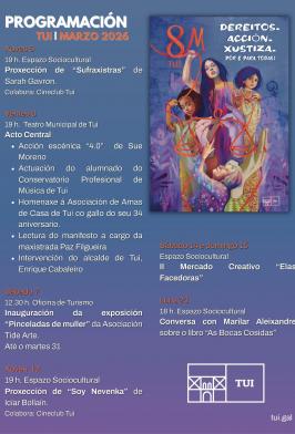 Baixo o lema “Dereitos, Xustiza e Acción, por e para todas”, neste 8M, Día Internacional da Muller, o Concello de Tui deseñou unha ampla e diversa programación...