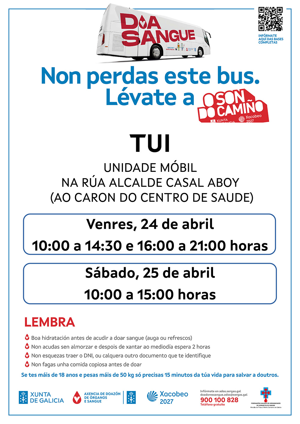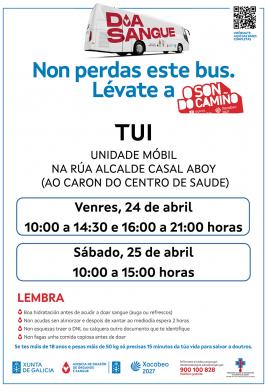 A Unidade Móbil de doazón de sangue de ADOS, a Axencia de Doazón de Órganos e Sangue de Galicia, estará en Tui o venres 24 e o sábado 25 de abril. Situarase na rúa Casal Aboy, a...