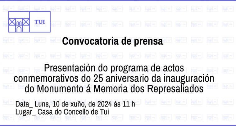 O próximo luns, 10 de xuño, ás 11 h, na casa do concello de Tui presentarase o programa de actos conmemorativo do 25 aniversario da inauguración do monumento á Memoria dos...
