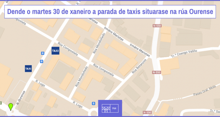 Dende mañá martes, 30 de xaneiro, a parada de taxis de Tui cambia de emprazamento e situarase na rúa Ourense a carón da parada do autobús, en ambos sentidos.