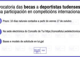 O Concello de Tui, na súa aposta polo deporte, incrementou até os 15 mil euros a partida destinada á concesión de becas a deportistas tudense que teñan participado en competicións...