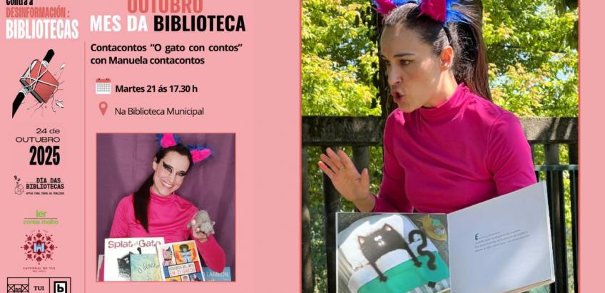 O próximo martes, 21 de outubro, continúan na Biblioteca Municipal de Tui as actividades do “Mes da Biblioteca”. Será ás 17.30 h cunha sesión de contacontos, para nenos a partir de 5 anos, a cargo de Manuela contacontos que trae o espectáculo “O gato con contos” .