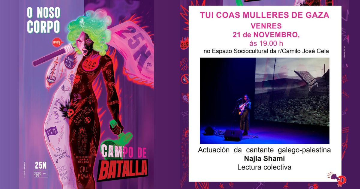 Este venres 21 celébrase o acto “Tui coas mulleres de Gaza” ás 19 h no Espazo Sociocultural da rúa Camilo José Cela, coa actuación da cantante galego-palestina Najla Shami e cunha lectura colectiva. Este acto forma parte da programación organizada polo Concello de Tui baixo o lema “O noso corpo campo de batalla” con motivo do 25N, Día Internacional para a Eliminación da Violencia contra a Muller, alzando a voz contra o ataque aos dereitos humanos que está a acontecer en Gaza.