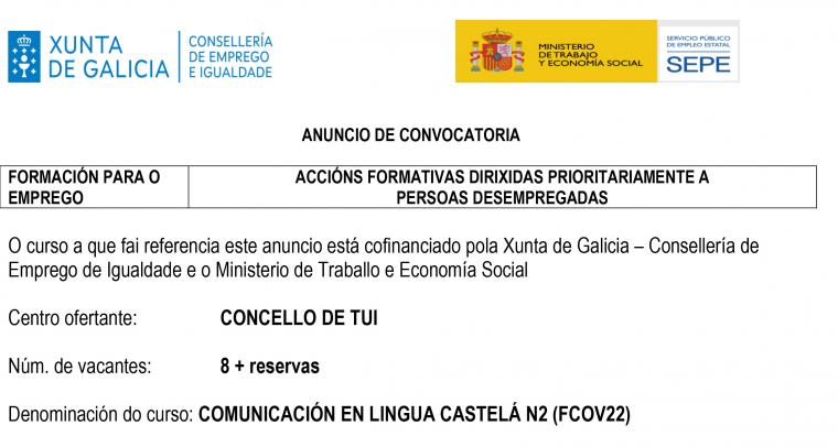 O Concello de Tui dispón de 8 prazas vacantes para a realización do curso de competencia clave FCOV22 Comunicación en lingua castelá N2.