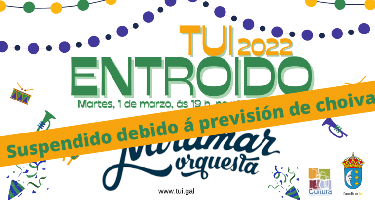 Debido á previsión de choiva para mañá martes, 1 de marzo, suspéndese a actuación da Orquestra Miramar programada a partir das 19 h na rúa Compostela con motivo do Entroido.
