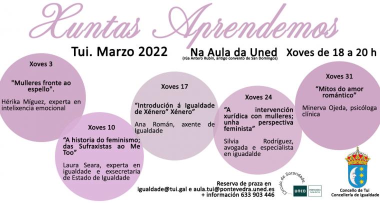 “Xuntas aprendemos” é o título das actividades que se van desenvolver os xoves do mes de marzo na Aula da UNED de Tui organizadas pola concellería de Igualdade do Concello de Tui...