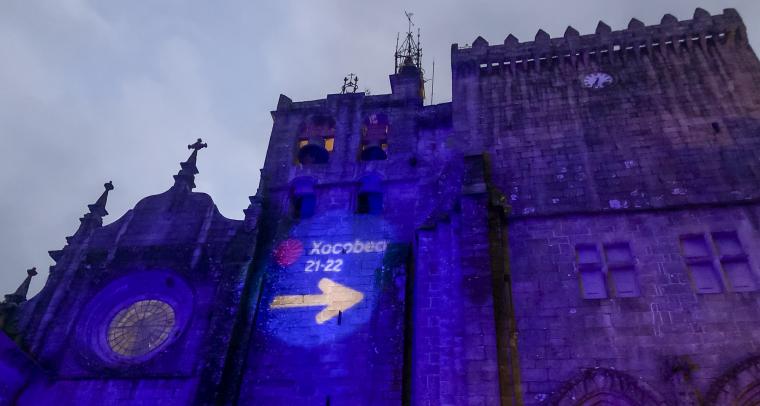 A fachada norte da Catedral de Tui permanece ao longo destas festas de Nadal, ata este xoves 6 de xaneiro, iluminada co logotipo da celebración do Xacobeo 2021-2022, nunha...