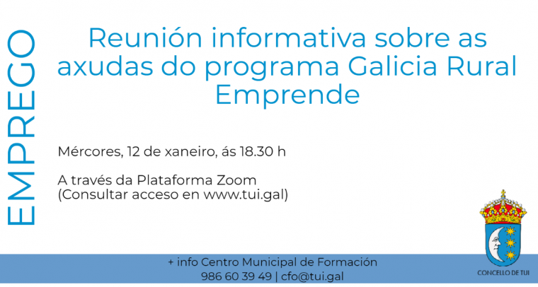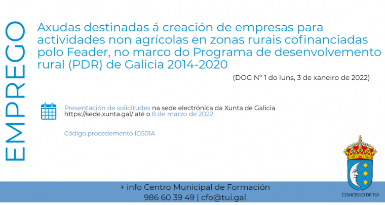 Mañá mércores, 12 de xaneiro de 2022, ás 18.30 h terá lugar unha reunión informativa sobre as Axudas destinadas á creación de empresas para actividades non agrícolas en zonas...