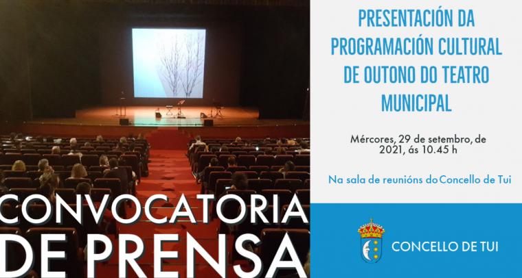 Mañá mércores, ás 10.45 h, na sala de reunións da casa do concello de Tui terá lugar a presentación da programación cultural de Outono que se vai celebrar no Teatro Municipal...