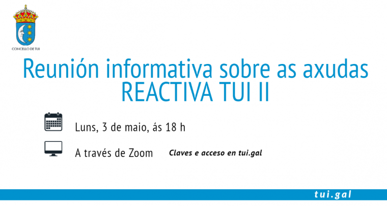 O luns, 3 de maio, ás 18 h terá lugar unha reunión telemática informativa sobre as axudas do programa Reactiva Tui II do Concello de Tui dirixido a persoas autónomas e...