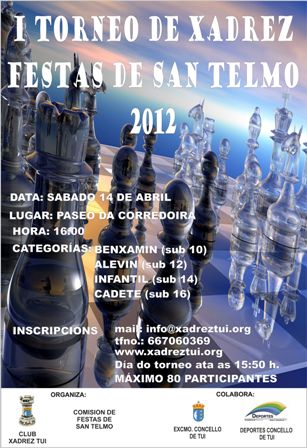 Este sábado 14 de abril, a partir das 16.00 horas, no Paseo da Corredoira, celebrarase o I Torneo de Xadrez Festas de San Telmo, organizado polo Club Xadrez Tui coa colaboración...