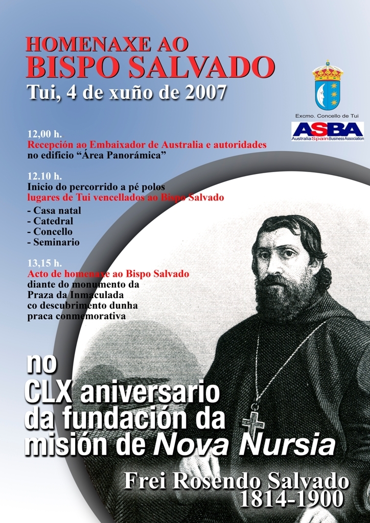 TUI ACOLLE O VINDEIRO LÚNS 4 DE XUÑO UNHA HOMENAXE A FREI ROSENDO SALVADO PRESIDIDA POLO EMBAIXADOR DE AUSTRALIA A cidade de Tui acollerá o vindeiro lún 4 de xuño de 2007 un acto de homenaxe á figura de Frei Rosendo Salvado, misonero no século XIX en Australia, co gallo do CLX aniversario da fundación da abadía-misión de Nova Nursia. Estes actos estarán presididos polo Embaixador de Australia en España, Noel Campbell, e polo Alcalde de Tui en funcións, Antonio Feliciano Fernández Rocha.O programa desta homenaxe é o seguinte:12,00 h.: Recepción ao Embaixador e convidados no edificio Área Panorámica de Tui.De seguido percorrido a pé por diversos lugares da cidade tudense vencellados á figura do P. Salvado: a súa casa natal, Catedral, Concello e Seminario.13,15 h.: Descubrimento dunha praca conmemorativa na estatua ao Bispo Salvado na Praza da Inmaculada.Estes actos están organizado polo Concello de Tui e a Australia-Spain Business Association – ASBA Galicia e xorden do crecente interese que a figura do frade tudense Rosendo Salvado suscita en Australia. Así queren rendirlle esta homenaxe de lembranza e respeto ao conmemorarse este ano o CLX aniversario da fundación da abadía- misión de Nova Nursia.A súa defensa dos aborixes australianos nunha época colonial onde eran completamente desprezados e marxinados e o proxecto que concebiu para a súa misión de Nova Nursia suscitan, cada día con máis forza, respeto e admiración.Nos actos a celebrar en Tui asistirán tamén diversas entidades e colectivos que promoven nos últimos años as relacións entre Galicia e Australia. FREI ROSENDO SALVADO naceu en Tui o 2 de marzo de 1814, tras realizar os seus estudios no Seminario tudense e ao negarlle as ordes sagradas o Bispo de Tui trasladouse ao mosteiro benedicitino de San Martiño Pinario, en Santiago de Compostela, onde salienta pola súas habilidade coa música como organista. Tras a desamortización trasládase ao mosteiro de La Cava en Nápoles – Italia onde finalmente é ordeado presbíteroen 1839.Máis tarde acolle a invitación da Congregación “Propaganda Fidei” para evanxelizar en Australia. A Igrexa Católica quere introducirse no nacente mercado australiano, un enorme territorio dominado polos ingleses e no que a Igrexa anglicana leva, unha boa ventaxa na conversión dos indíxenas. Chega, xunto con outros monxes benedictinos, o 8 de xaneiro de 1846 ás costas de Australia. O primeiro obxectivo que tiñan os monxes era atopar indíxenas. Rosendo Salvado foi clarividente á hora de evaluar a problemática indixena en Australia. O que era extraño na súa época en Australia era a consideración que tiña polos indixenas. O 1 de marzo de 1846 celebran a súa primeira misa no lugar que ían misionar e un ano despois, 1 de marzo de 1847, comeza a construcción da abadía misión de Nova Nursia. Este acontecemento é que lembraremos en Tui o vindeiro lúns.En 1849 é nomeado Bispo de Porto Victoria, pero axiña retorno á Nova Nursia, ao pecharse aquela colonia. Promoveu a creación dun Colexio Misionero Benedictino en El Escorial e que Silos, Montserrat e Samos foran declarados “Colegios de Ultramar”; é considerado como restaurador da Orde Benedictina en España.Amáis de bo literato posuía grandes coñecementos de botánica e era un excelente músico. A súa querencia polos aborixes levouno a renunciar aos nomeamentos como Bispo de Porto Rico e Lugo e a solicitar a Inglaterra o ser declarado aborixe australiano, para mellor defendelos nun momento histórico de mentalidade colonial e racistaVisitou Roma, por última vez á avanzada idade de oitenta e seis anos. Hospedouse no mosteiro de San Pablo, onde se convertiria nunha figura de referencia para os novos cregos polas súas historias da misión.Morreu o 29 de decembre de 1900 e o seu corpo foi levado de volta para ser enterrado baixo o altar da pequena Catedral de Nova Nursia.Mantivo sempre unha estreita relación coa cidade de Tui que visitou en varias oportunidades e onde residía a súa familia.