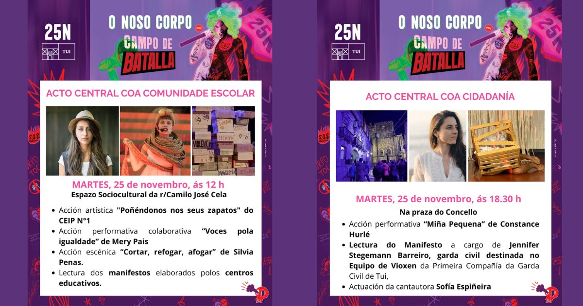Abrirá o acto a acción artística “Poñéndonos nos seus zapatos” do CEIP Nº1 de Tui. Unha intervención simbólica que invita a ocupar, de maneira metafórica, o lugar das vítimas, fomentando a empatía e a conciencia social. A continuación Mery Pais presentará a acción performativa colaborativa “Voces pola igualdade” que busca promover a reflexión e conciencia crítica sobre as distintas formas de violencia cara ás mulleres a través da arte e a expresión visual. Contarase tamén coa participación de Silvia Penas coa acción escénica “Cortar, refogar, afogar”. É unha peza poético-performativa con intervención sonora e percusión en directo que achega unha reflexión arredor do corpo feminino como espazo de conflito, centrándose no cabelo. Para rematar darase lectura aos manifestos elaborados polos centros educativos.