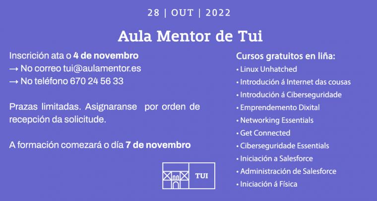 Até o 4 de novembro está aberta a inscrición para os cursos en liña e gratuítos que ofrece a Aula Mentor. As prazas son limitadas. As persoas interesadas deben inscribirse na Aula...