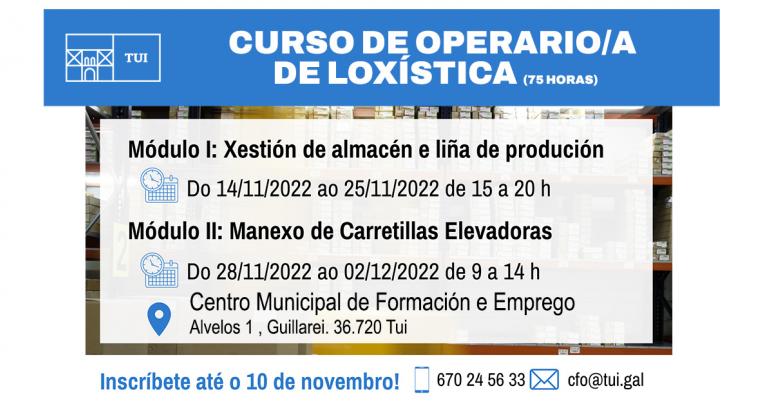 Até o próximo xoves, 10 de novembro, está aberto o prazo de inscrición para o curso de Operario/a de loxística de 75 horas lectivas que se vai impartir no Centro Municipal de...