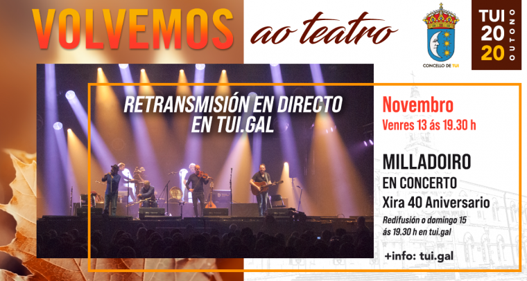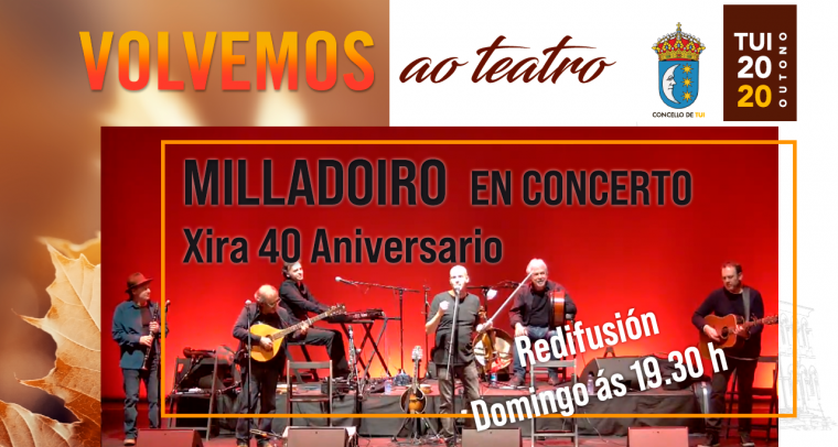 Dende o Teatro Municipal de Tui poderase seguir en directo o concerto que o grupo Milladoiro ofrece hoxe ás 19.30 h dentro da xira do seu 40 aniversario.