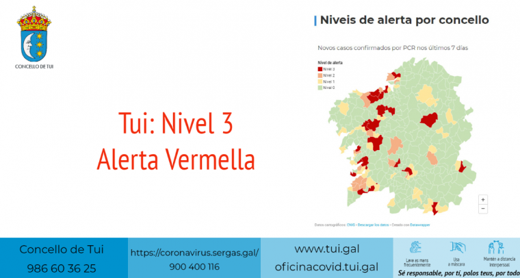 Tui entrou esta mañá en alerta vermella por COVID 19 segundo o mapa da Xunta. Ante esta situación o Concello de Tui acordou o e peche das instalacións municipais de carácter...