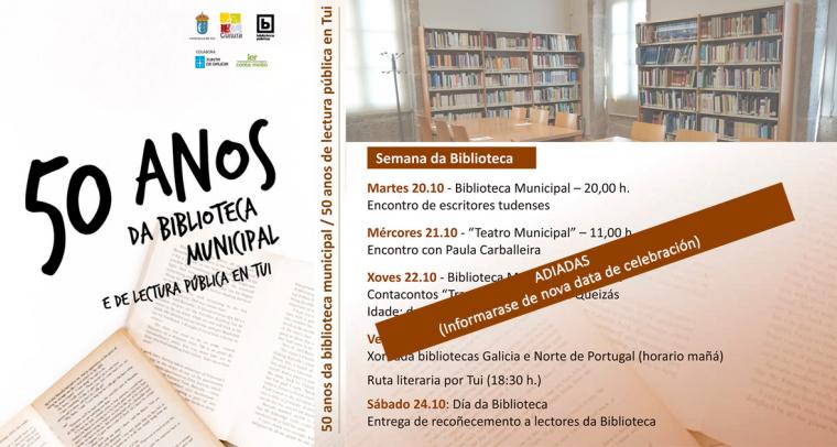 O Concello de Tui comunica que as actividades programadas para esta semana pola Biblioteca Municipal de Tui para conmemorar o 50 aniversario da súa creación son adiadas, para unha...