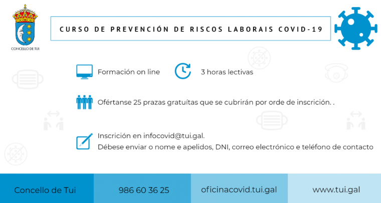 O Concello de Tui, a través da concellería de Formación, oferta un curso on line de “Prevención de riscos laborais COVID19”.