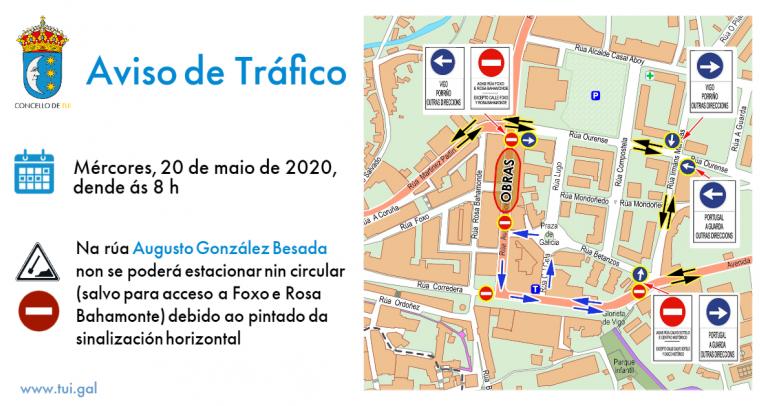 Mañá mércores, 20 de maio, vaise proceder ao pintado da sinalización horizontal na rúa Augusto González Besada, como paso previo ao establecemento do sentido único de circulación...