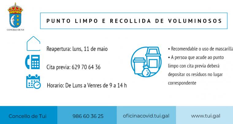 O próximo luns, 11 de maio, reabrirá o Punto Limpo do Concello de Tui situado en Guillarei. Será con cita previa que se debe solicitar no 629 70 64 36 de luns a venres de 9 a 14h...