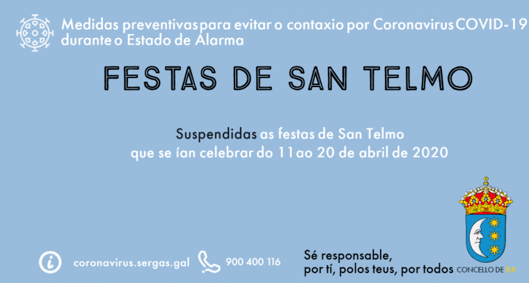 Comunícase a suspensión das festas de San Telmo que se ían celebrar do 11 ao 20 de abril de 2020. Dada a actual situación de pandemia global por coronavirus e do estado de alarma...