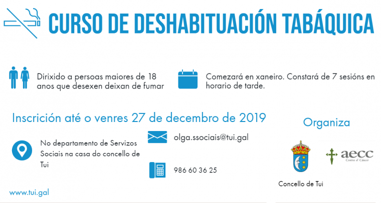 No mes de xaneiro comezará en Tui un novo curso de Deshabituación Tabáquica organizado polo Departamento de Drogodependencias do Concello de Tui en colaboración coa Asociación...