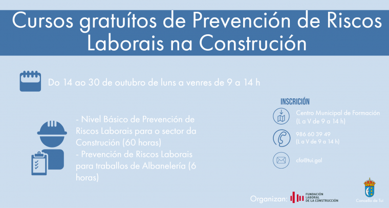 O Concello de Tui en colaboración coa Fundación Laboral da Construción oferta dous cursos gratuítos de prevención de riscos laborais. Celebraranse na segunda quincena do mes de...
