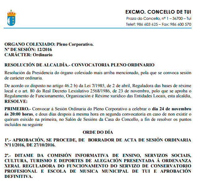 A corporación municipal de Tui reúnese mañá xoves, 24 de novembro, ás 20h en pleno de carácter ordinario coa seguinte orde do día: