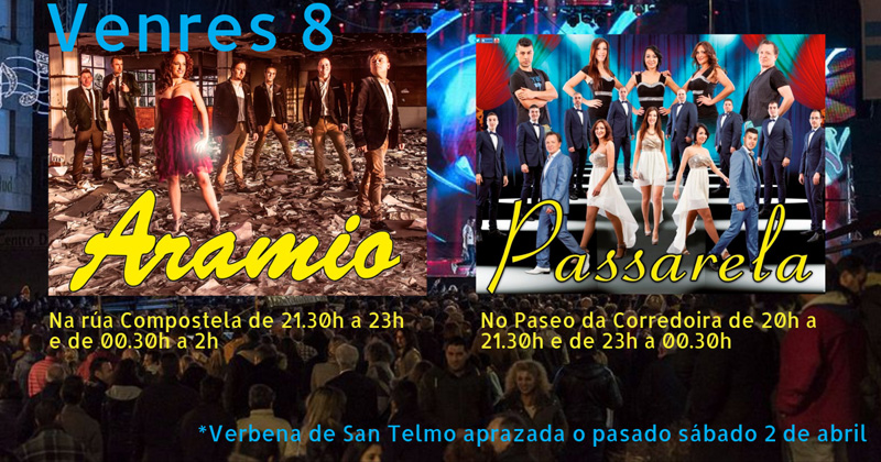 Hoxe venres, 8 de abril, celebrarase a verbena de San Telmo 2016 aprazada o pasado sábado pola choiva. Será amenizada pola orquestra Passarela no Paseo da Corredoira de 20 a 21....
