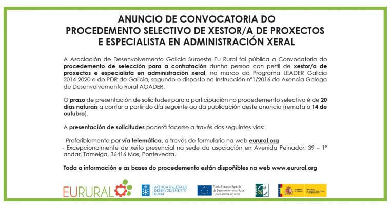 A Asociación de Desenvolvemento Galicia Suroeste Eu Rural fai pública a Convocatoria do procedemento de selección para a contratación dunha persoa con perfil de xestor/a de...