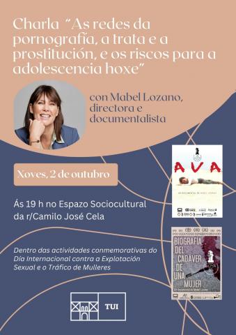 O xoves, 2 de outubro, ás 19 h no Espazo Sociocultural da rúa Camilo José Cela, terá lugar a charla “As redes da pornografía, a trata e a prostitución, e os riscos para a adolescencia hoxe” dirixida á cidadanía en xeral a cargo da directora e documentalista Mabel Lozano.