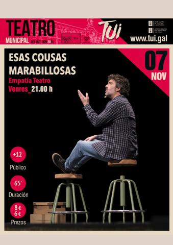 O venres 7 de novembro ás 21.00 h chega ao Teatro Municipal de Tui Empatía Teatro con “Esas cousas marabillosas”. Esta peza do dramaturgo e director Duncan MacMillan, traducida e dirixida por Avelino González, foi estreada en 2022 con Elisardo de la Cruz no Festival Internacional do monólogo de Narón.