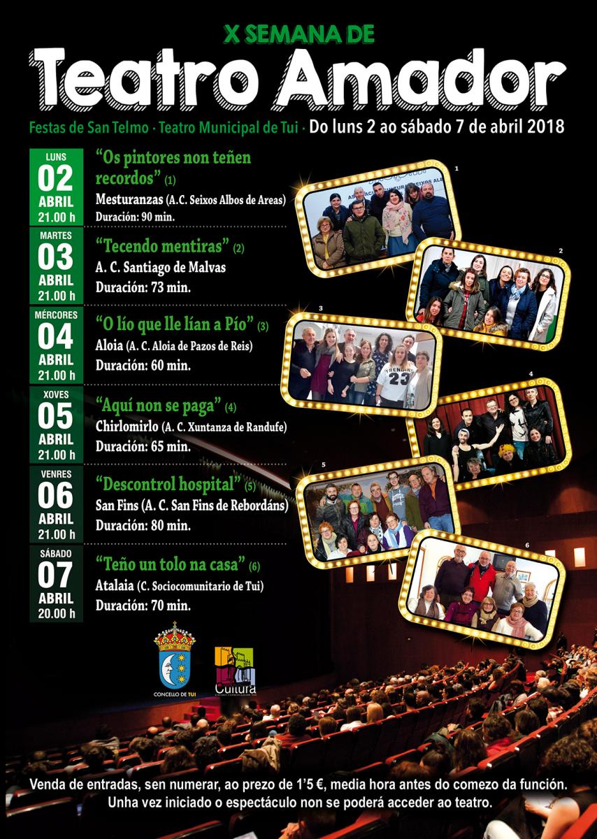 A Semana de Teatro Afeccionado celebrará a súa décima edición do luns 2 ao sábado 7 no Teatro Municipal de Tui onde os grupos Mesturanzas de Areas, Santiago de Malvas, Aloia de Pazos de Reis, San Fins de Rebordáns, e Atalaia do Centro Sociomomunitario de Tui presentarán as súas últimas montaxes, en moitos casos en estrea. Amais as tres corais de Tui do Centro Sociocomunitario, Ponte das Febres e San Telmo actuarán no centro Amoralia e nas Residencias San Telmo e Paz y Bien.