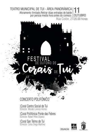O Teatro Municipal de Tui acollerá o mércores, 11 de outubro, ás 20h o Festival de Outono de Corais de Tui no que participarán as tres agrupacións corais do municipio. Serán a coral do Centro Sociocomunitario de Tui dirixida por Moisés Lorenzo Alonso, a Coral Polifónica Ponte das Febres de Ribadelouro baixo a dirección de Rafael Pérez Dopeso, e a Coral San Telmo dirixida por Celso Diéguez Martínez.